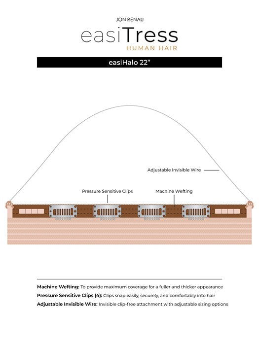 The easiHalo 22″ human hair extension by Jon Renau is a handmade halo extension that features 100% Chinese Human Hair cut into a fabulous layered hairstyle. The gradual layered design allows the hair to blend into your bio hair for extra volume. The “no show” wire is adjustable for a customizable and secure fit. Also available 12″ and 18″ lengths.