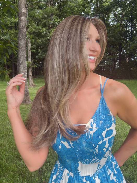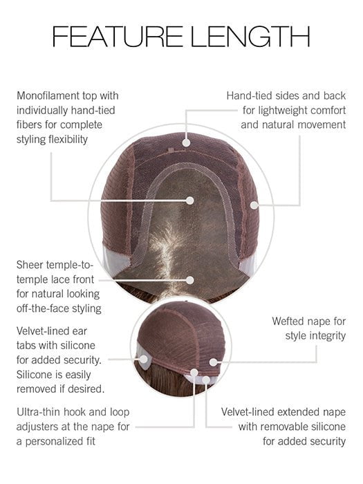 The LuxLite Cap II has been upgraded for an even lighter feel and now features an expanded monofilament area for a more natural appearance. This innovative cap construction includes a freestyle knotting design, eliminating any ridges or bumps from the top of the wig to the crown. Designed with an average circumference, the cap is made from stretchable material to comfortably conform to various head shapes. Additionally, the hand-stitched, removable silicone at the ear tabs and nape ensures a secure and customizable fit.