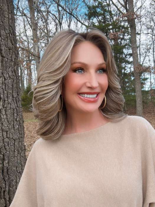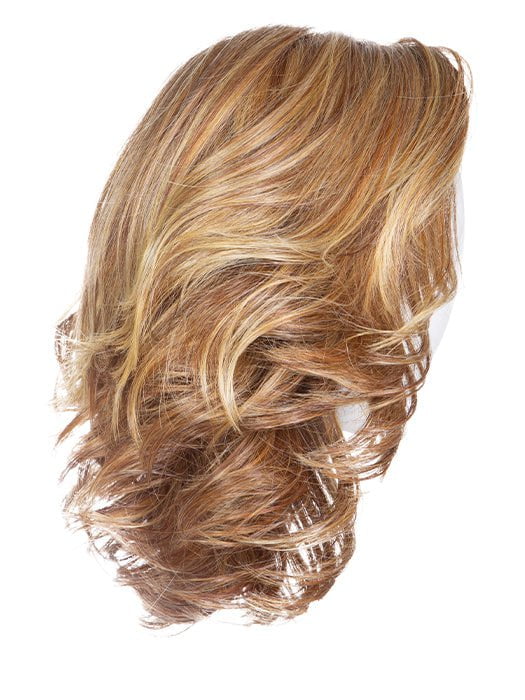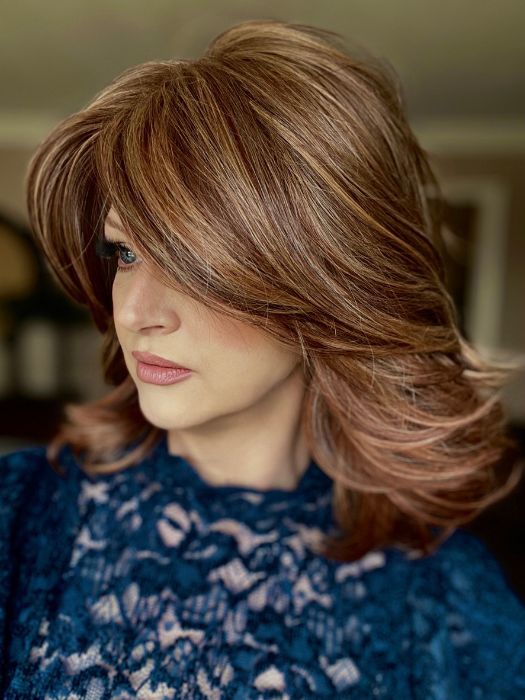 Flip the Script by Raquel Welch features a trendy butterfly haircut with an off-center part and eyelash bangs. This layered hairstyle has feathery edges and forms V-shape at back. The Tru2Life® synthetic fiber feels and looks like human hair and can be styled with heat tools. The full monofilament top mimics the look of natural hair growth. The extended temple-to-temple lace front creates a realistic hairline.