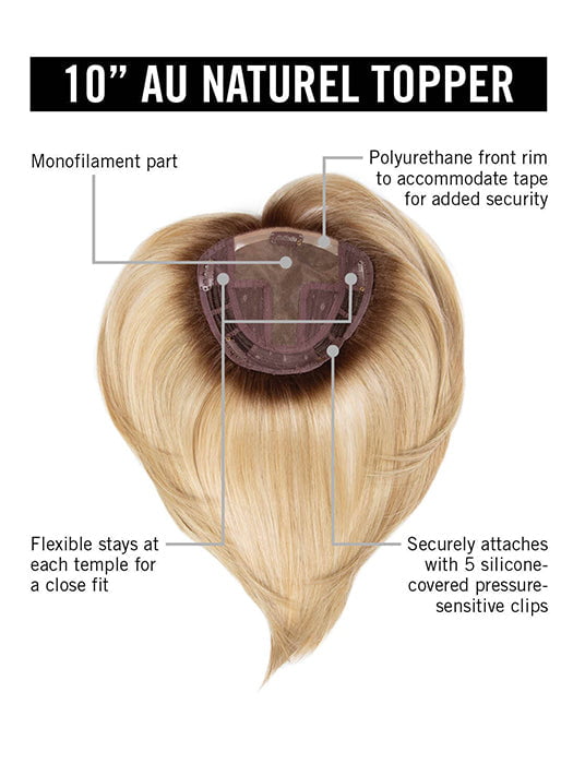 HD 10IN AU NATUREL TOPPER by Hairdo secures into your bio hair with clips for an effortless blend. This heat friendly synthetic fiber is low density for comfortable and flawless coverage.