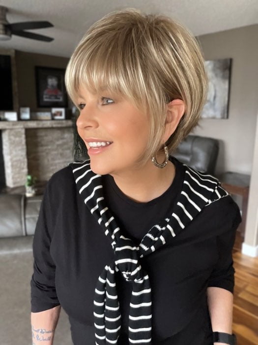 Innuendo by Gabor is a short, choppy bob wig with razored ends. This contemporary cut combines long, sleek layers around the face and sides with lots of textured ends in the back. A quick shake right out of the box and its ready to wear!