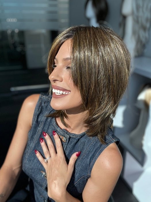 Inspire Me by Gabor is part of the Designer Series. Featuring a classic medium bob, the face-framing layers flatter most face shapes while creating natural movement and body. The Tru2Life heat friendly synthetic fiber gives the option to style the hair into a sleek pageboy for a chic hairdo.