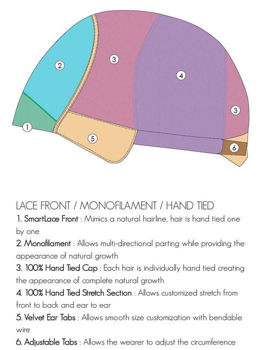 The SmartLaceâ„¢ Front mimics a natural hairline and each hair is hand tied one by one. The top is made with a sheer material to give a scalp look and create natural volume. The entire cap has is hand-tied for comfort, natural movement, and styling versatility. The synthetic hair is pre-styled with full layers and is ready-to-wear out of the box.
