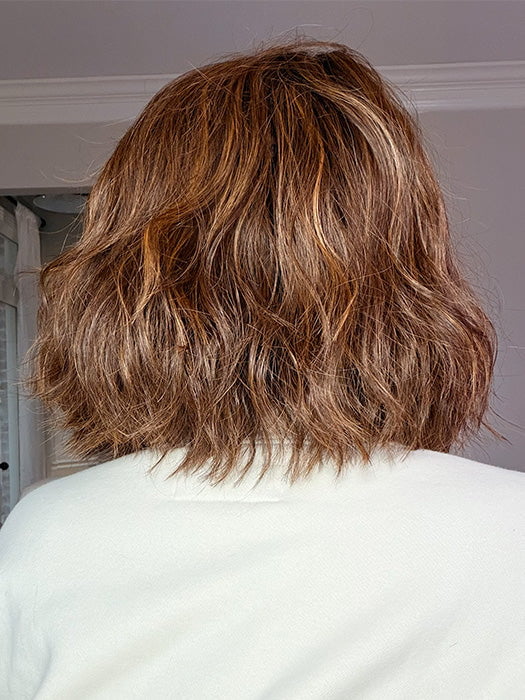 Nyx by Rene of Paris is a Bohemian-inspired hairstyle with beachy waves and choppy layers. Part of the Hi-Fashion Collection, this short bob wig has an extended lace front for off-the-face hairstyles. The monofilament part gives the illusion of hair growth. The cap has pull adjusters and extended nape tabs for a more comfortable fit. Â