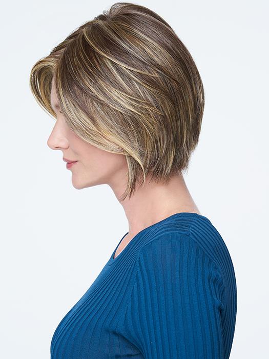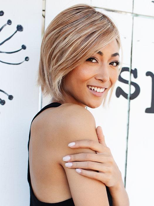 Real Deal by Raquel Welch features shattered ends and razor-cut lengths to give this modern bob both popular and practical appeal. The close fitting nape and flattering eyelash bang work together to create a confident look that’s also very feminine. Heat style the ends turned under or with a sassy upwards flick. Try wearing with one side tucked behind the ear.