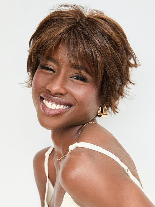 Star by Rene of Paris is a cute short wig from the Orchid Collection. This playful hairstyle has choppy layers for added texture. The lace part and extended lace front create a discreet hairline. The heat friendly synthetic hair allows you to flip up the ends or smooth down the hair for an elegant look.