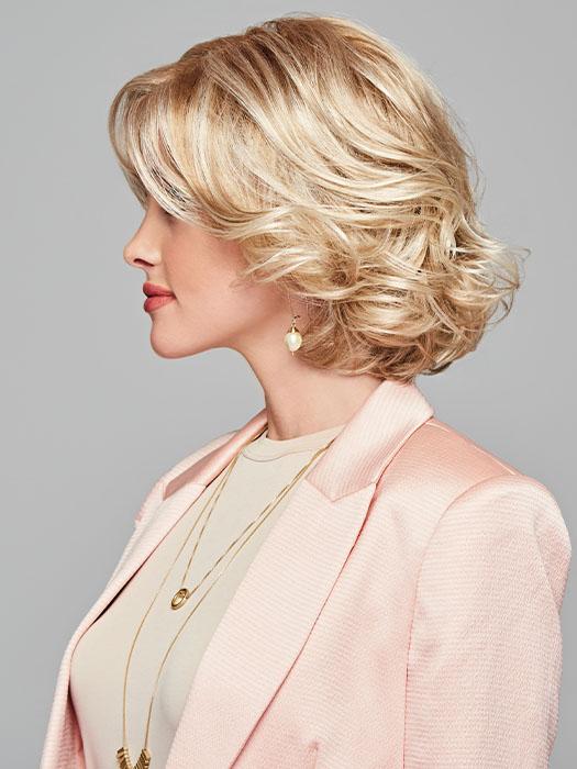 The Twirl & Curl Wig by Gabor is smooth at the top with voluminous loose barrel curls throughout the sides and back. The look is polished and sophisticated. Brush through to create a soft and smooth layered bob, or spritz with water and scrunch for piecey texture.