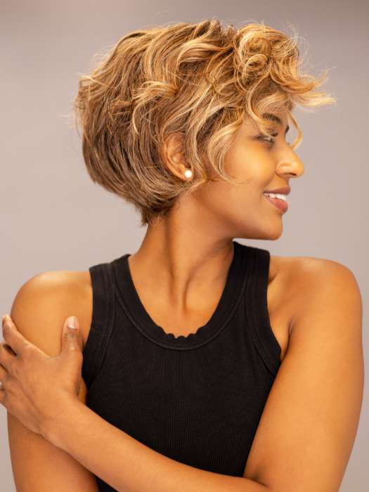 Twisted Pixie by TressAllure showcases a trendy pixie bob with unstructured curls for a carefree hairstyle. The tapered back creates a more streamlined silhouette. Part of the Look Fabulous Realistic Collection, this light-density short wig is crafted with heat friendly synthetic fiber for versatile styling. The monofilament top and lace front give the illusion of hair growth for a realistic appearance.Â