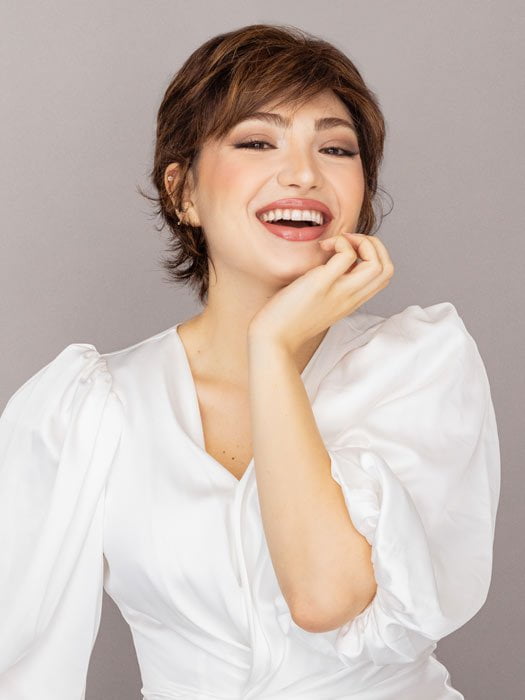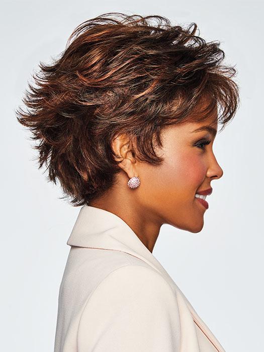 Voltage, a personal favorite of Raquel Welch is now available in Voltage Petite! This short wig is bold, textured, and features all-over layers that are feathered to perfection. The wispy bang and flared neckline make it gorgeous at every angle. This shake and go” style can be styled soft and layered out of the box, or messy and modern using the Shaping Creme by BeautiMark. The Vibralite synthetic fiber looks and feels like human hair, and is available in a variety of salon inspired hues, also available in gray colors, beautiful shades of grey.